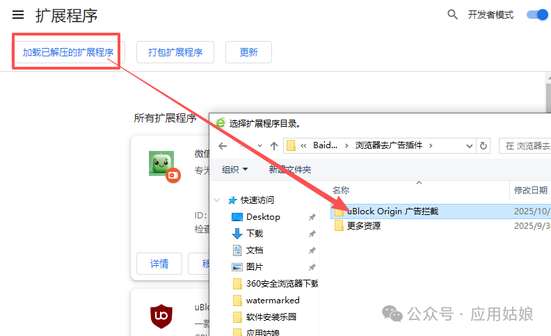 3、加载插件:1.加载已解压的扩展程序,2.选择解压好的文件夹,
