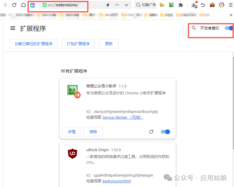 2、打开 Chrome 浏览器,然后打开插件管理页面:1.可以直接访问 chrome://extensions 进行打开;2. 打开开发者模式
